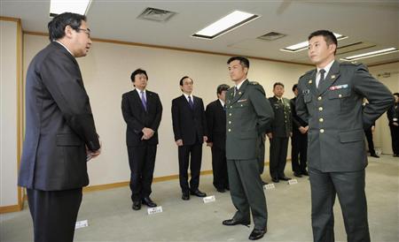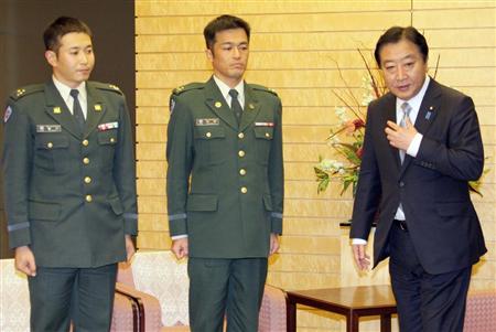 ![]() 南スーダンPKO司令部の細川拓彦1等陸尉、中村晋士1等陸尉(左から)を激励する野田佳彦首相=25日午後、首相官邸(酒巻俊介撮影) |