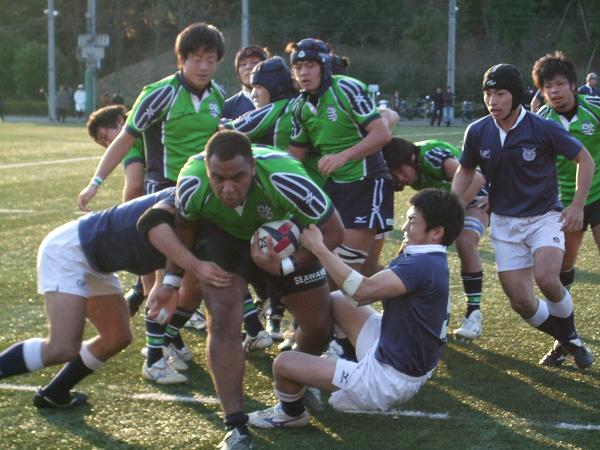 | 【試合経過】 セットプレーでのプレッシャーをかけ続けること、DFを待たずに詰めること、攻撃を思い切って、防大らしく戦うこと、激しいDFで敵を圧倒することを確認して試合に臨みました。 前半 防大KO 前半、西日を背に有利な陣地を選択して戦いました。 3分、No10中條が相手陣ゴール前に蹴りこみ、白鴎大がピンチ脱出のためタッチキックを選択します。 相手陣22mでのマイボールラインアウトというトライチャンスが防大に訪れます。 ラインアウトでNo5大野が確実にキャッチし、モールを作り、相手ゴールへ向けて押し込みます。 FWの体格を比較すると防大FWが小柄で、体重差も不利でしたが、よくまとまってモールを押し込み、先制トライを奪います。No14清水のゴールキックも決まり、先制します。(7-0) 10分、白鴎大は、防大陣地ゴール正面でPKを得て、ショットを選択し、PGが決まります。(7-3) その後も、一進一退の攻防が続きます。ファーストスクラムの場面では、FW体重差を活かされ、防大ボールのスクラムでしたが、ホイールし、惜しくも相手ボールスクラムになります。 しかし、防大FWは、プレッシャーをかけ続け、白鴎大が8単を仕掛けますが、防大バックローの激しいタックルで、ゲインを許さず押し戻します。 15分、防大は相手ゴール前スクラムでは、ホイールしないよう、ローバーで球出しを早くして、対応しますが、トライチャンスは訪れません。 20分、白鴎大は、防大陣地でのスクラムから、No13が防大DFラインのギャップを突いて、トライを奪います。その後のキックも決まり、逆転を許します。(7-10) 25分、防大は、相手陣地までFWがラッシュをかけますが、相手ゴールラインまでは及びません。 27分、白鴎大は、FWがラッシュをかけ、トライを奪い、引き離します。(7-17) 31分、防大は、No10中條が相手陣ゴール前にオープンキックを蹴りこみ、これに対応しようと白鴎大BKも下がりますが、バウンドしたボールが防大側に跳ね返り、キックチェースした中元がキャッチし、フォローした西森が相手ゴールに飛び込み、トライを奪います。その後のコンバージョンキックも決まり、白鴎大を追い上げます。(14-17) 37分、防大は相手陣前までFWが継続してボールをつなぎ、大きくゲインしますが、相手ゴール目前でノットリリースの反則を取られ、トライチャンスを逃します。 その後も、相手陣地での攻防が続き、試合の流れは防大に傾きつつある中で前半を終えました。 後半 白鴎大KO 5分、防大はBKで右展開し、相手ゴール前に迫りますが、最後までボールを継続できず、トライチャンスを逃します。 21分、相手陣でプレーを継続する防大に再びチャンスが訪れます。BKで早いオープン攻撃を仕掛け、ウイングまでボールを回した後、No14清水がタッチライン際まで大外へ大きくスワーブし、 相手DFを俊足で引き離し、逆転トライを奪います。(19-17) 僅差ながら、逆転に成功したことで試合の流れは防大に大きく傾きます。 39分、No13山中が相手DFの裏にボールを蹴り上げ、No11宮木が走り込んでキャッチし、トライを奪います。その後のキックもNo14清水が成功させ、白鴎大を引き離します。(26-17) 40分、ロスタイムで、防大陣地ゴール前でピンチを迎えます。 白鴎大はスクラムから8単で防大DFを突破し、トライを奪われます。(26-22) その後のコンバージョンキックはポストを外れ、ノーサイドの笛がグランドに響き、防大の勝利が確定、2部昇格が決まりました。 試合終了間際の白鴎大の必死の追い上げを防大らしいプレー(激しいタックル、高いフィットネス) で封じ込めることができました。 長い4ヶ月のシーズンを通じ、グランドに応援に駈け付けて頂いたOB、全国から励ましの声を頂いたOBの方々に御礼申し上げます。ありがとうございました |