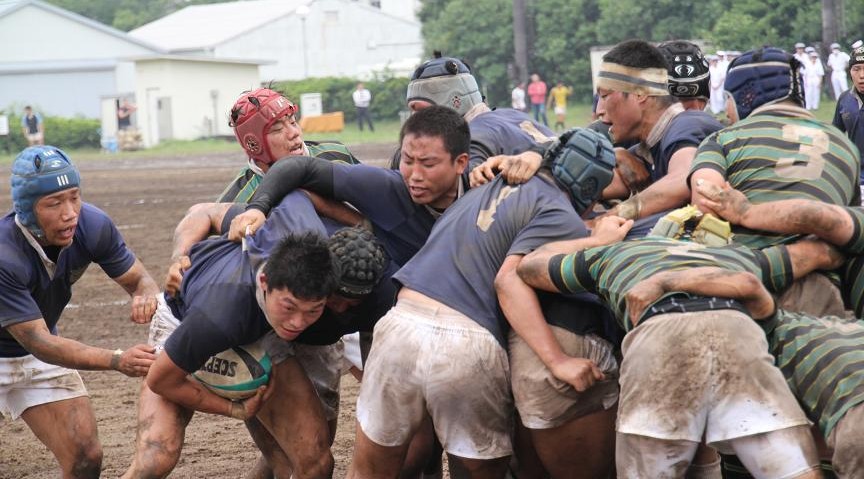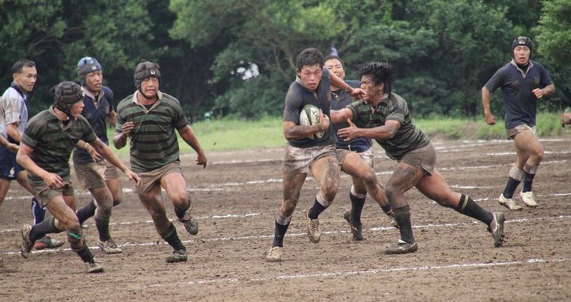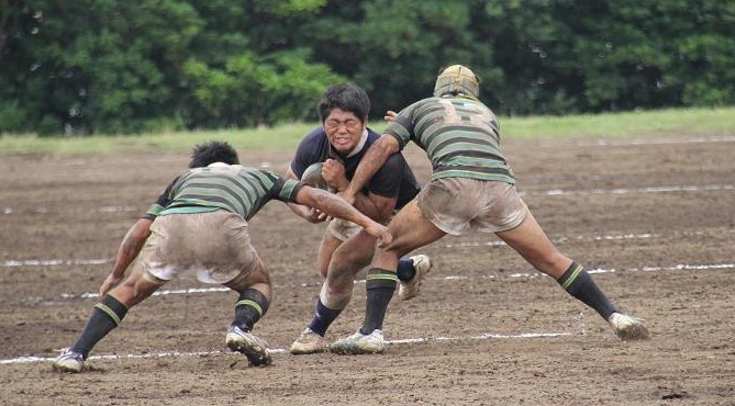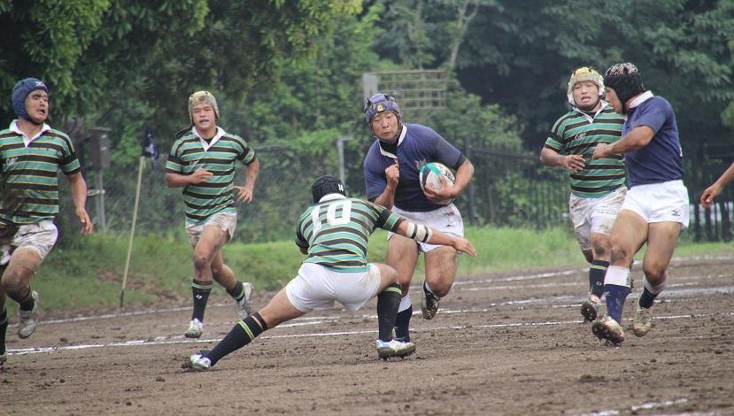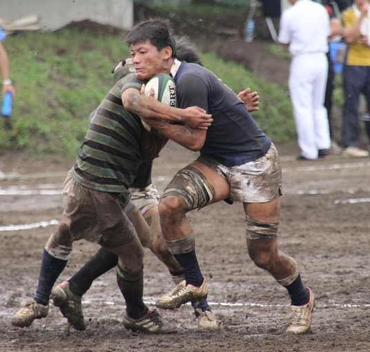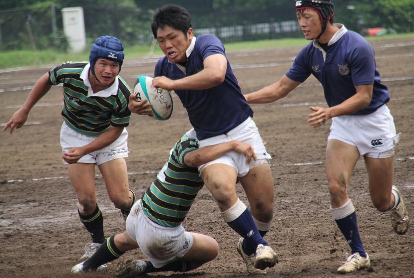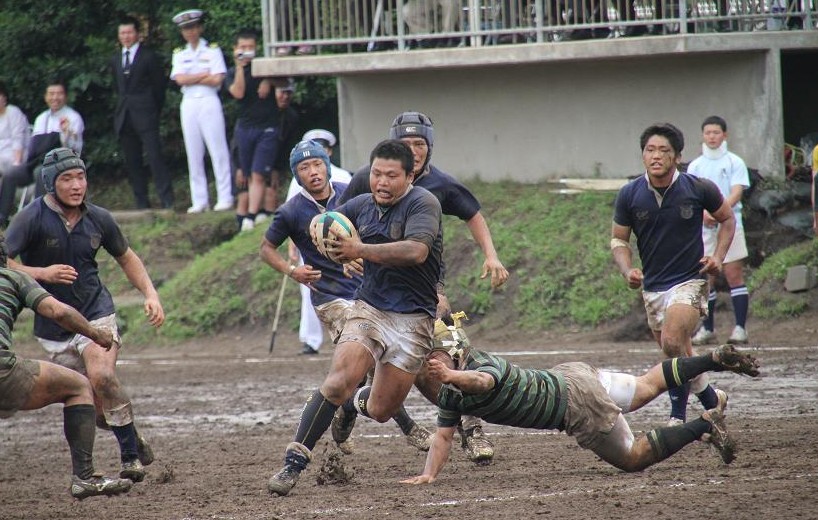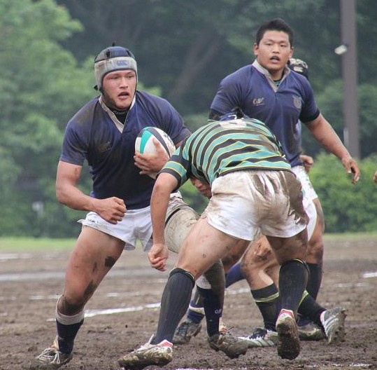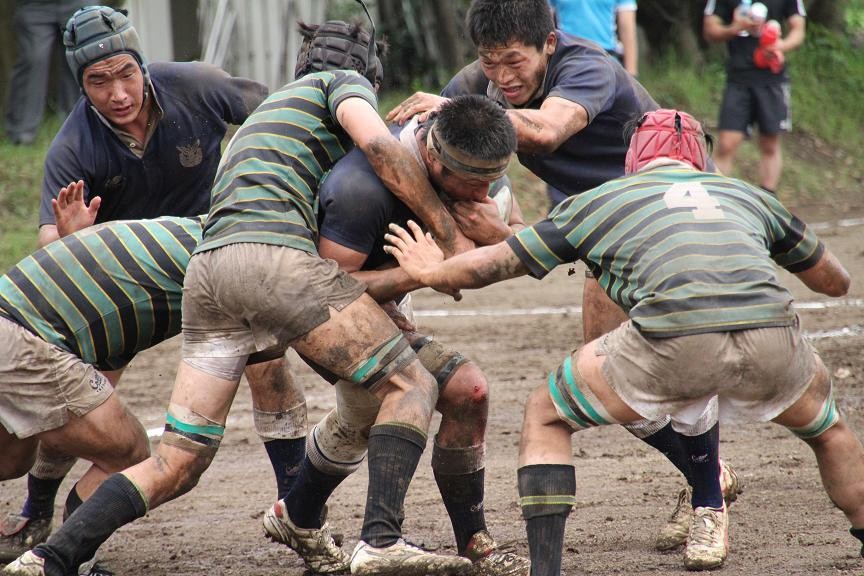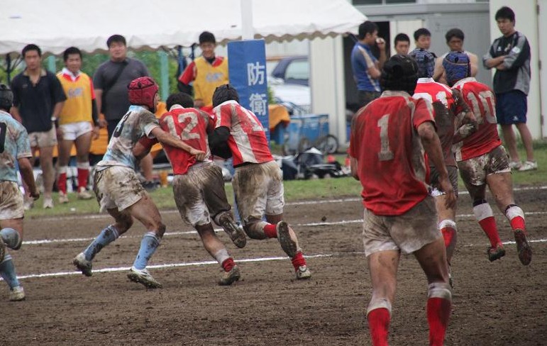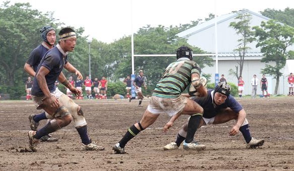 東京大学は3年前に人工芝のグラウンドに整備されたため、久しぶりの泥試合に臨む東大フィフティーンに対して、雨上がりのぬかるんだホームグラウンドで地の利を利用し、優位に試合を進めようとします。しかし、ぬかるみに足を取られミスが多発し、思うようなボール運びが出来ず、応援しているOBもやきもきしている様子でした。