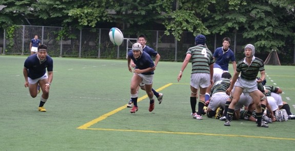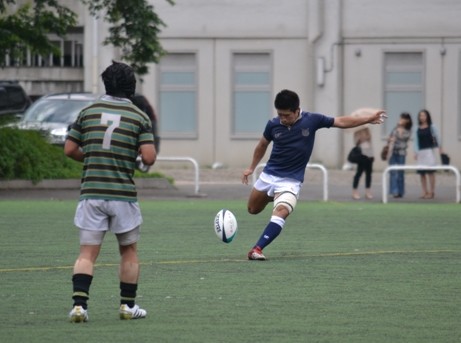 29分、東大ゴール前30mの位置でFKのチャンス。素早くBK左展開し、長身No13松井が突破して、そのままトライ。(30−7)