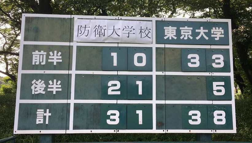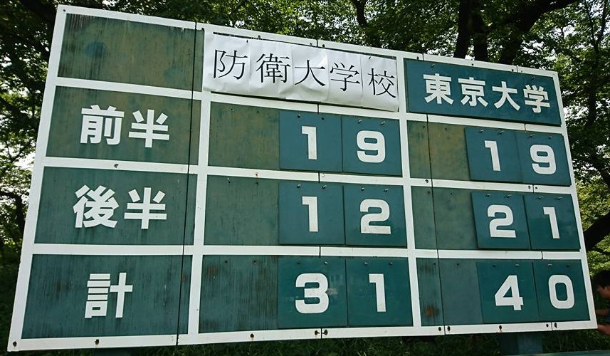KO 1455 40分×2 防大B 27−7 東大B 前半: 5(1T) −0 後半: 22(4T1G)−7(1T1G)