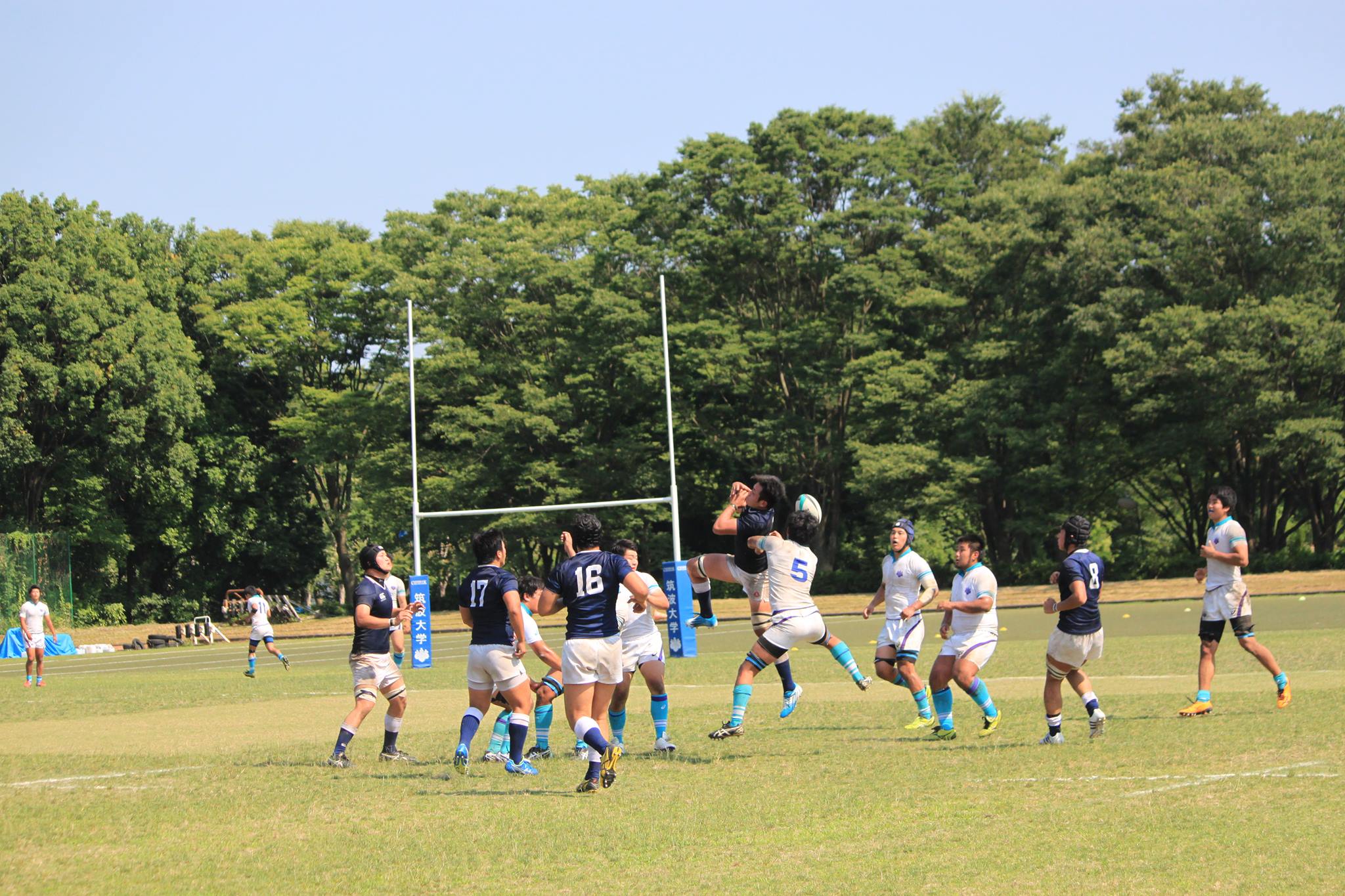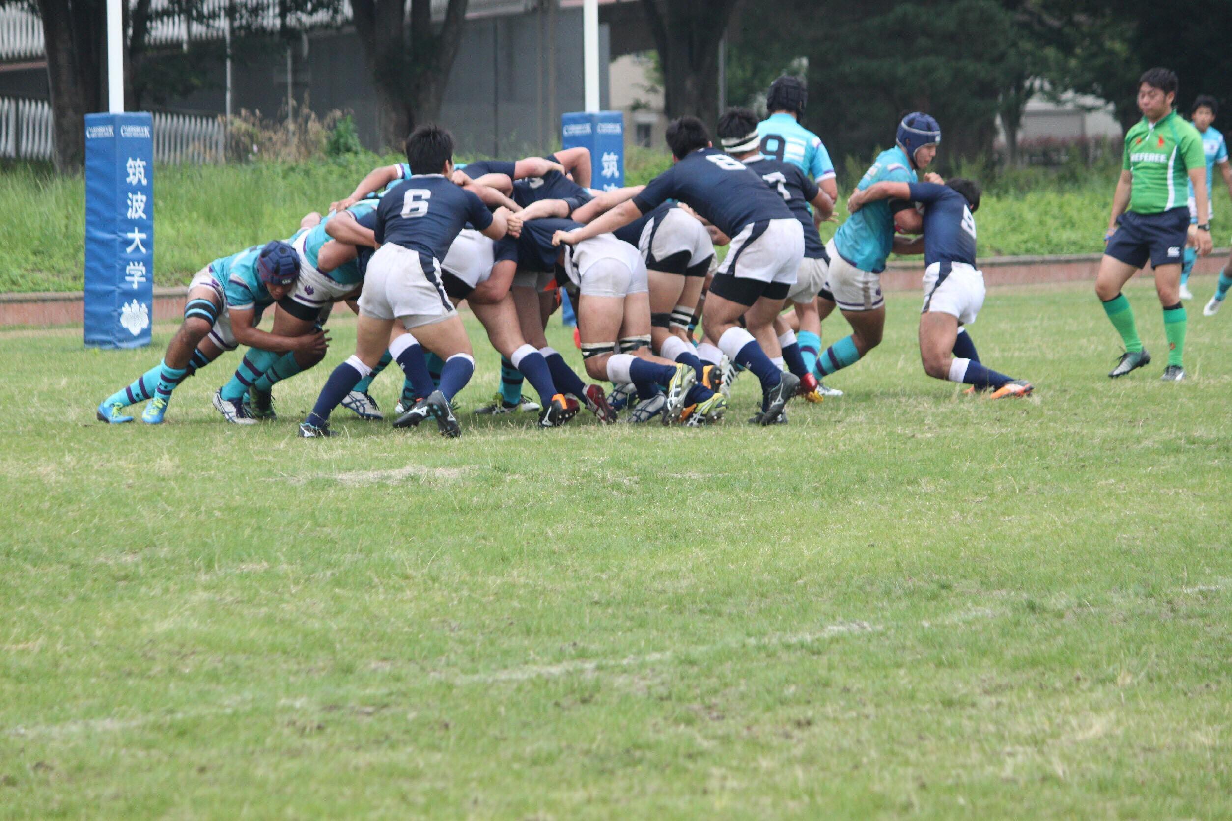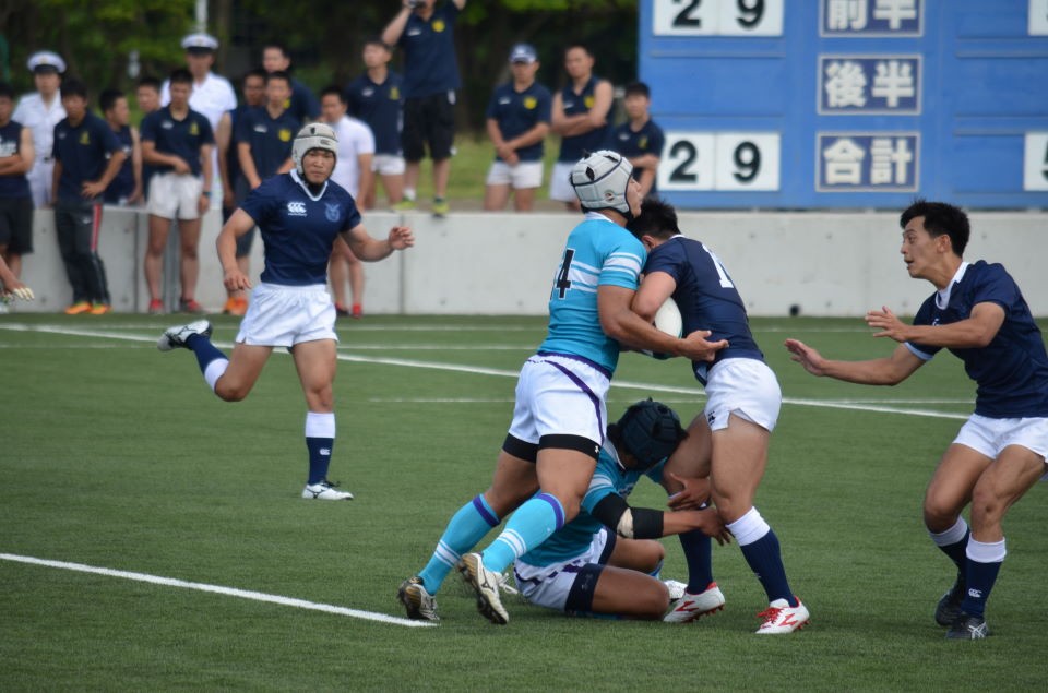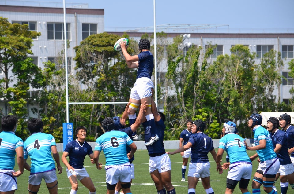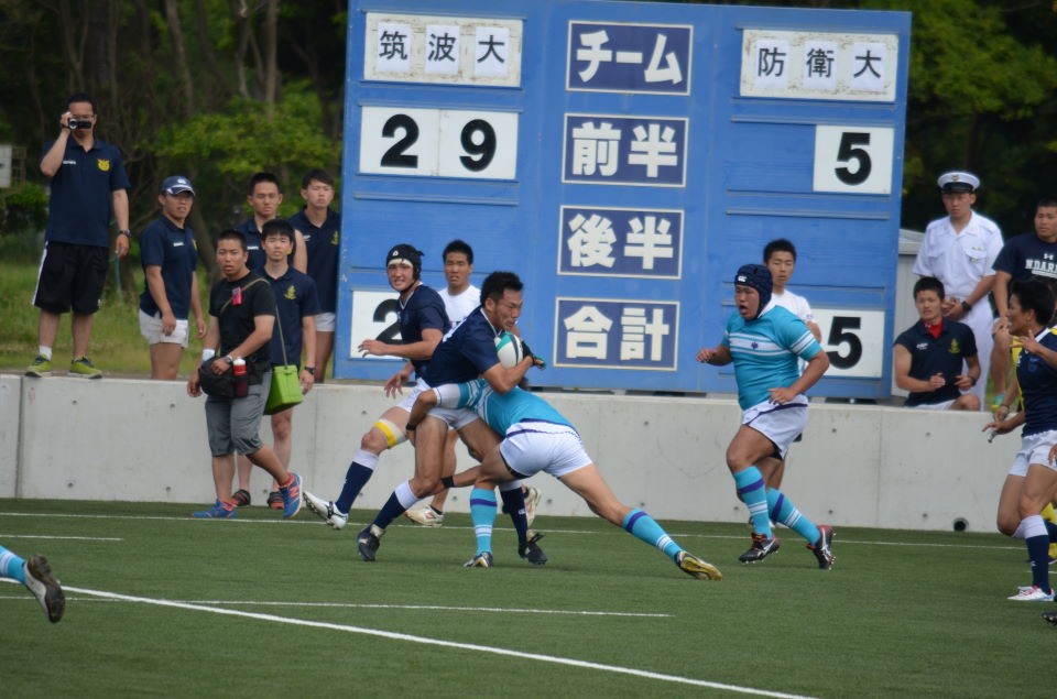 【試合経過】 前半 防大風上を選択しKO 両チーム、キックを活用した試合展開となります。 8分、防大は強気のプレーで相手の反則を誘い、筑波ゴール15m中央でPGを決め先制します。(3−0) 22分、筑波ゴール10mから左ラインアウトのチャンス得ます。No5大野が186cmの長身を活かし、確実にボールを確保し、モールに持ち込みます。そのまま押し込んでNo7富田がトライ。難しい位置からのコンバージョンキックをNo15清水が成功し、点差を広げます。(10−0) その後も敵陣で有利に試合を運びます。 30分、筑波ゴール15mからラインアウトし、モールで押し込む、得意の形で再びNo7富田がトライ。難しい位置からのコンバージョンキックをNo15清水が再び決め、防大リードのまま前半を折り返します。(17−0)