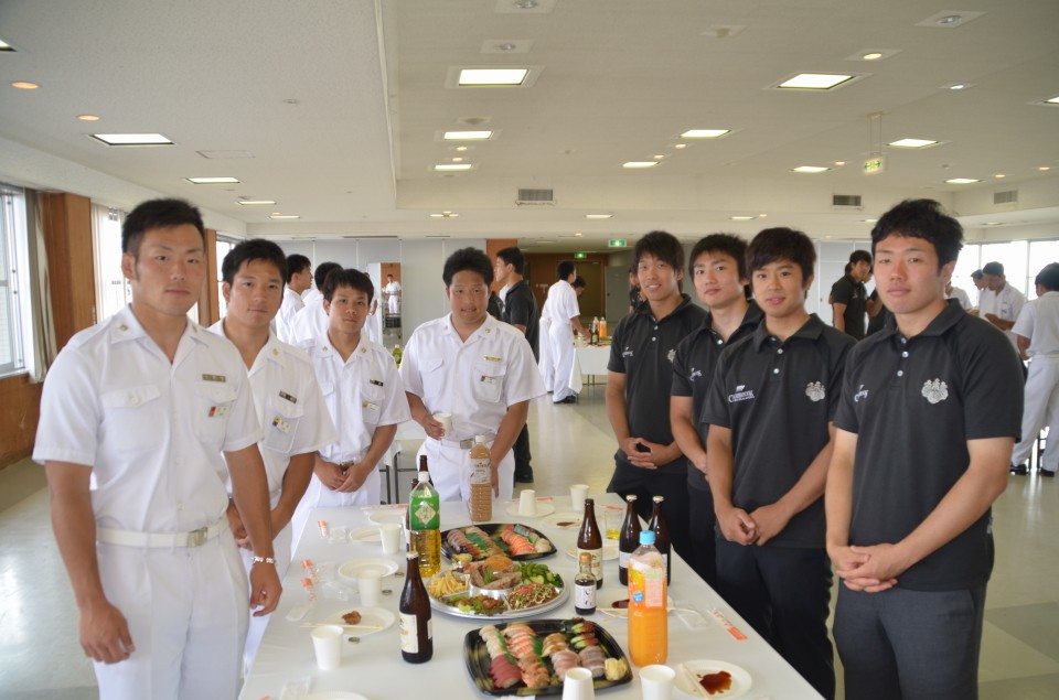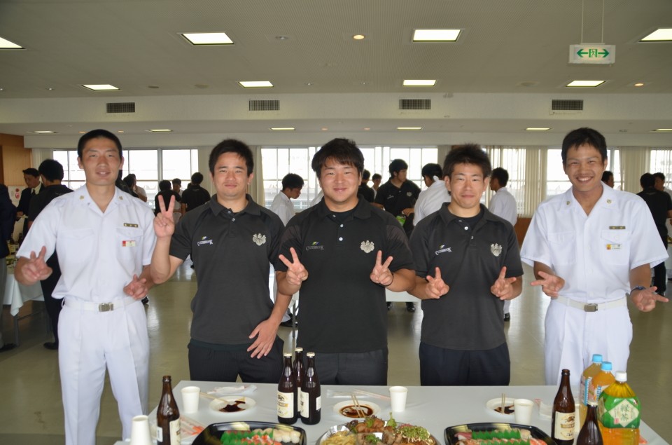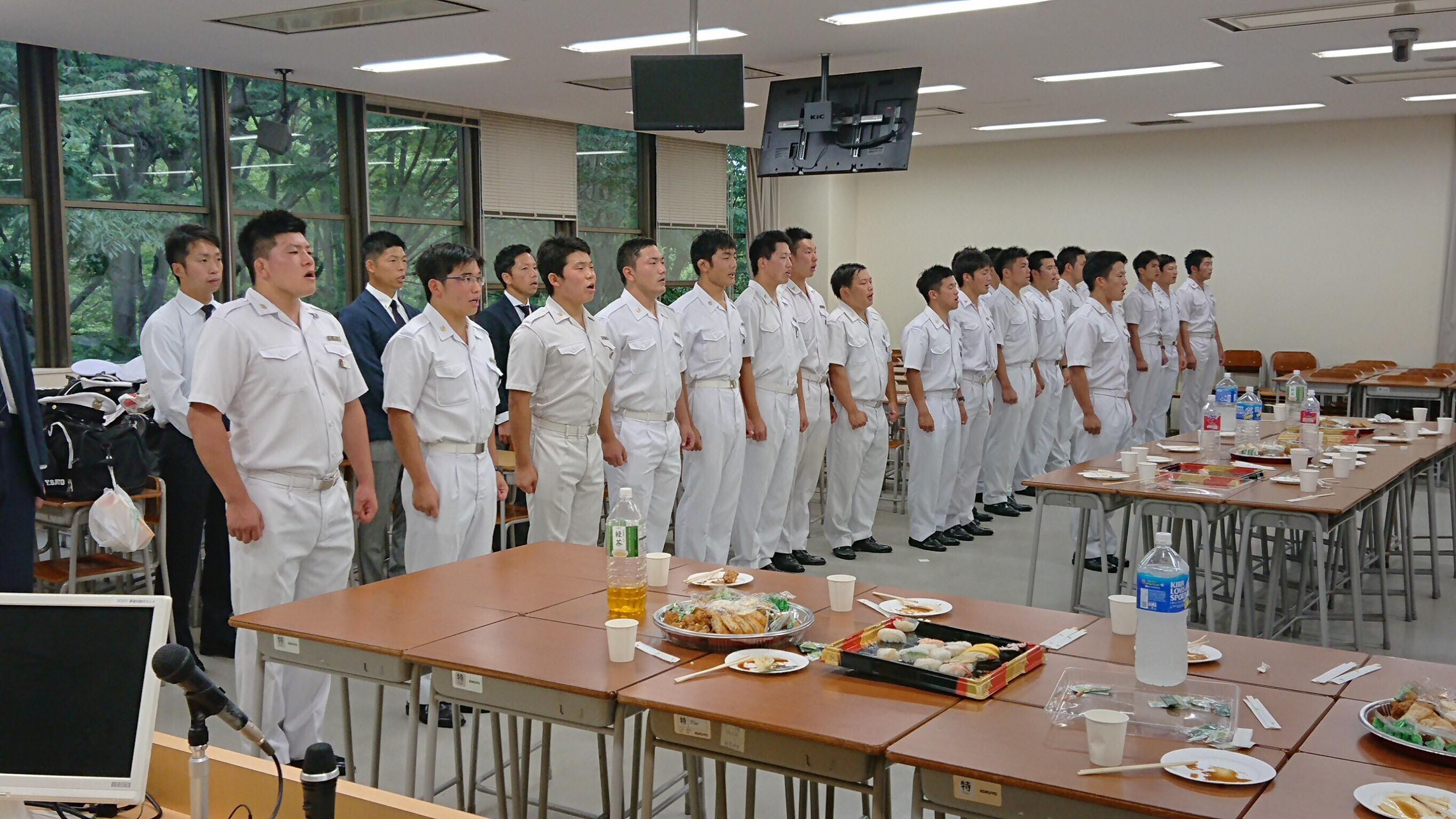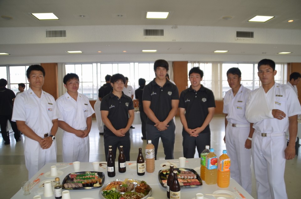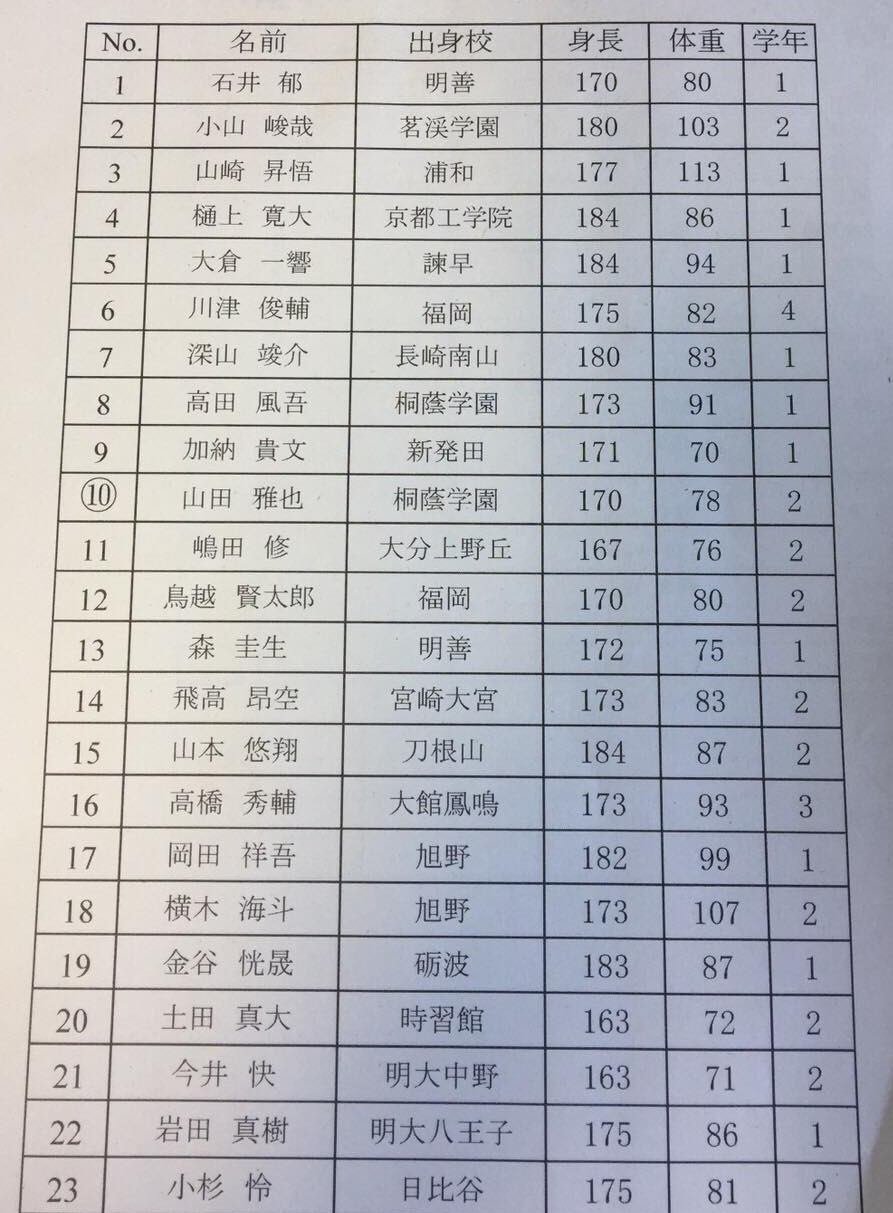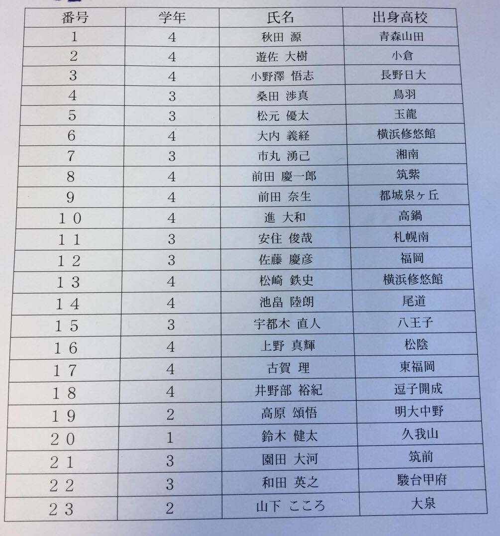 【スターティング・フィフティーン】 番号 氏 名 (学年)出身高校 1 茂木 翔大 (4) 少年工科学校 2 森島 康介 (3) 明和 3 三輪 晃大 (4) 宇部 4 葛城 陽志 (4) 秋田南 5 大野 弘樹 (4) 横手 6 櫻木 敬士 (4) 小倉 7 富田 幸隆 (2) 航空生徒 8 菊池 允宏 (4) 松山東 9 平野 公貴 (3) 海上生徒 10中條 智仁 (4) 四日市 11従二 光平 (4) 郁文館 12小池 誉士鷹(4) 海上生徒 13松井 薫平 (3) 匝瑳 14宮木 司 (4) 口加 15清水 北斗 (4) 諫早