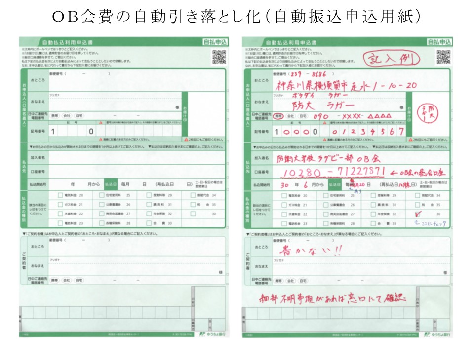 | 1 手続き可能場所 ゆうちょ(郵便局)の窓口(※ネット申し込みは未対応) 2 手続きに必要なもの ○ゆうちょの口座(他行からは現状未対応) ○ゆうちょの届印 ○口座番号のわかるもの(通帳又はカード等) 3 手続き要領 (1)窓口にて、「自動払込みの手続き」であることを明示し、用紙を受領 ※ガスや電気料金の自動払込みと同じ手順 (2)自動払込利用申込書(別添参照)に必要事項を記入 ○お申込み人 自身の情報を記入(届印を忘れないこと) ○払込先 ・加入者名:防衛大学校ラグビー部OB会 ・口座番号:10280−71227871 ・払込開始月:30年6月(又は12月から) ・払込日:毎年(月を二重線で削除)6月20日(再払込日12月末日) ・払込金の種別:30にチェック(※33会費ではないので要注意) ・振込手数料:OB本人負担(25円/回) (3)用紙を窓口に提出して終了 (4)引落し日を会報等により連絡、期日に6000円以上を口座に入金しておけばOK (5)複数回に分けたOB会費の引き落としについて(例:500円/月 等) 問題点:OB会事務局の引き落とし作業複雑化による多重引き落としの可能性 ⇒運用開始後、実施の可否について判断 |