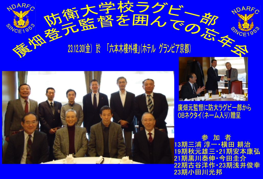 防大ラグビー部 廣畑登元監督を囲んでの忘年会 於「六本木樓外樓」(ホテル グランビア京都) 23.12.30 参加者10名 |