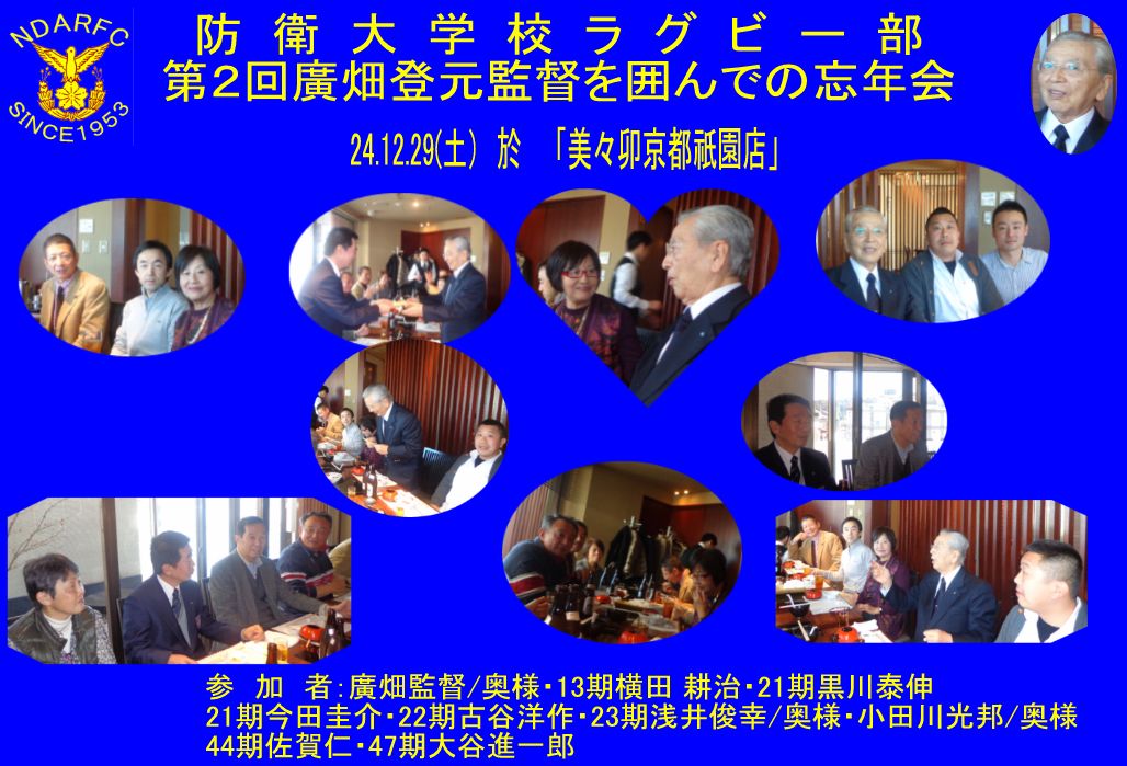 防大ラグビー部 第2回廣畑登元監督を囲んでの忘年会 於「美々卯 京都祇園店」 24.12.29 参加者12名 |