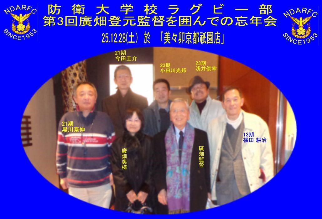 防大ラグビー部 第3回廣畑登元監督を囲んでの忘年会 於「美々卯 京都祇園店」 25.12.28 参加者5名 |