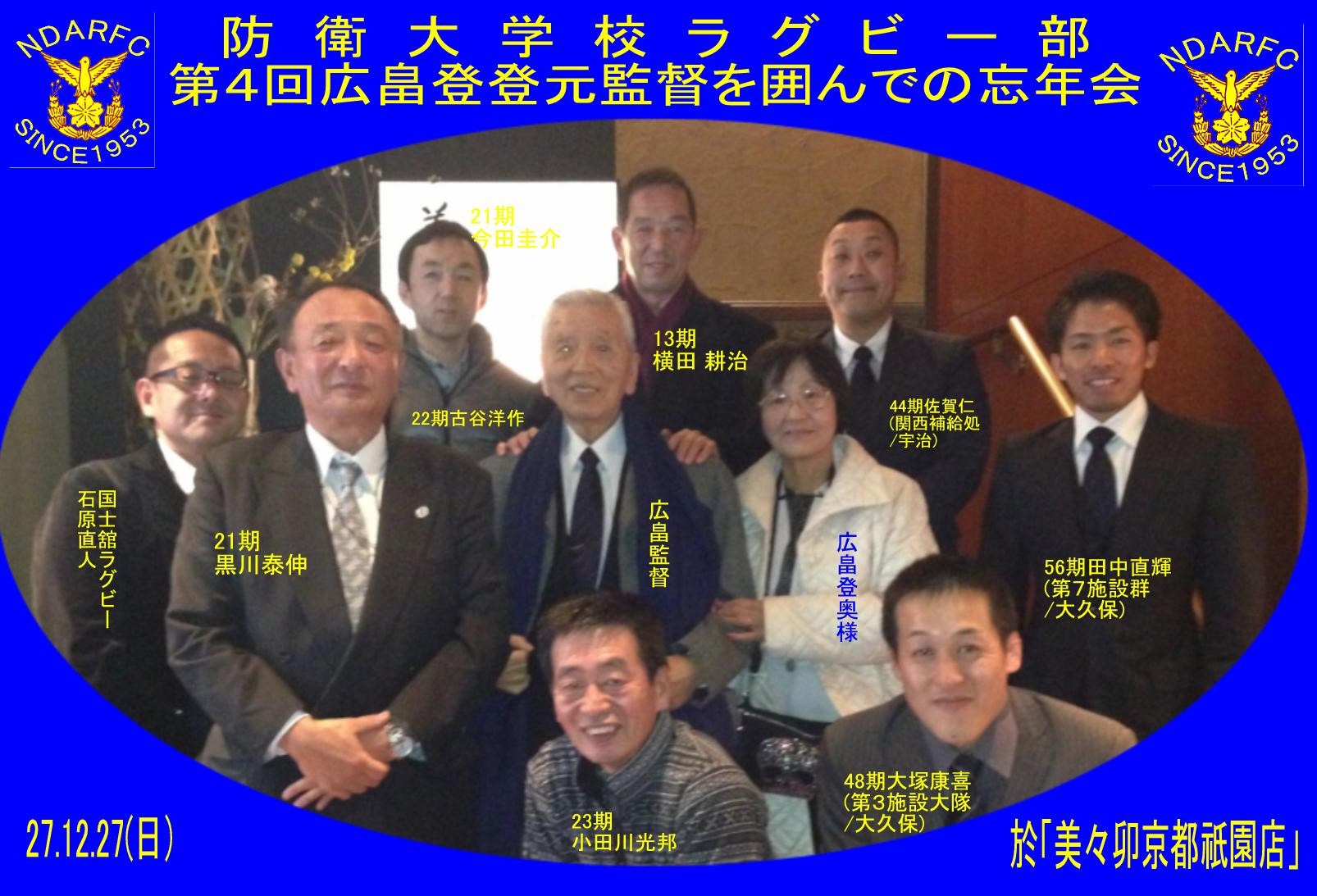 防大ラグビー部 第4回広畠登元監督夫妻を囲んでの忘年会 於「美々卯 京都祇園店」 27.12.27 参加者8名 |