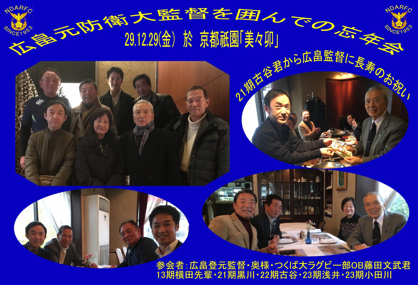 | 防大ラグビー部 第6回広畠登元監督夫妻を囲んでの忘年会 於「美々卯 京都祇園店」 29.12.29 参加者8名 |