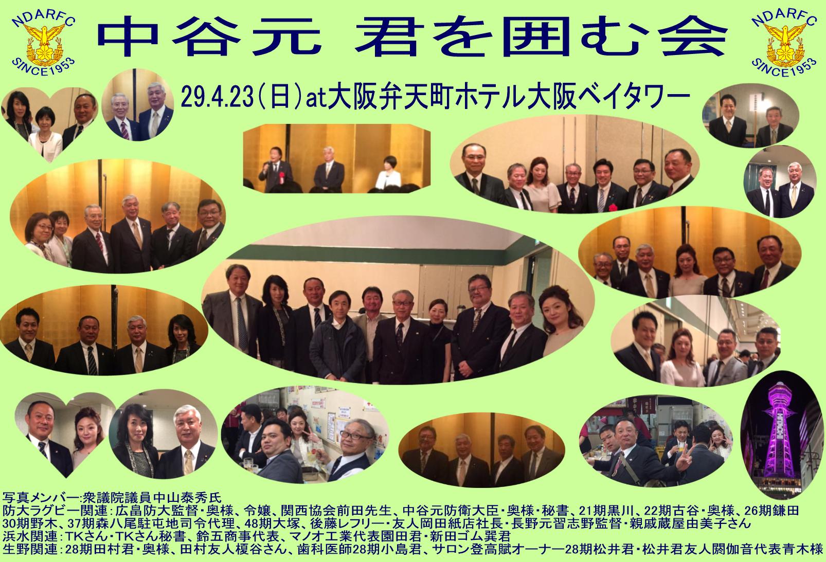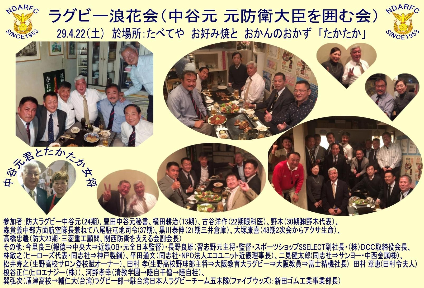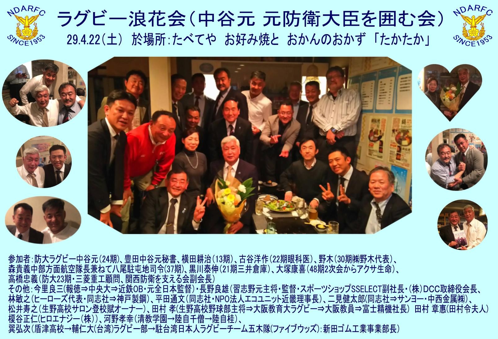 防大ラグビー部浪花会 (24期元防衛大臣中谷元君を囲んで) 29.4.22(土) at「たべてやお好み焼とおかんのおかず たかたか」 同23(日)ホテル大阪ベイタワー |