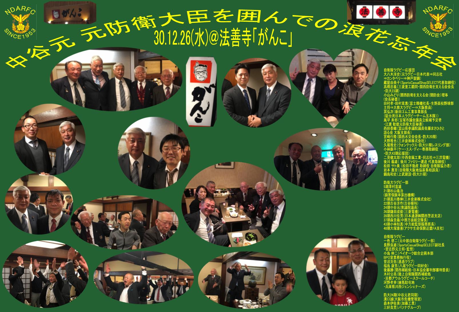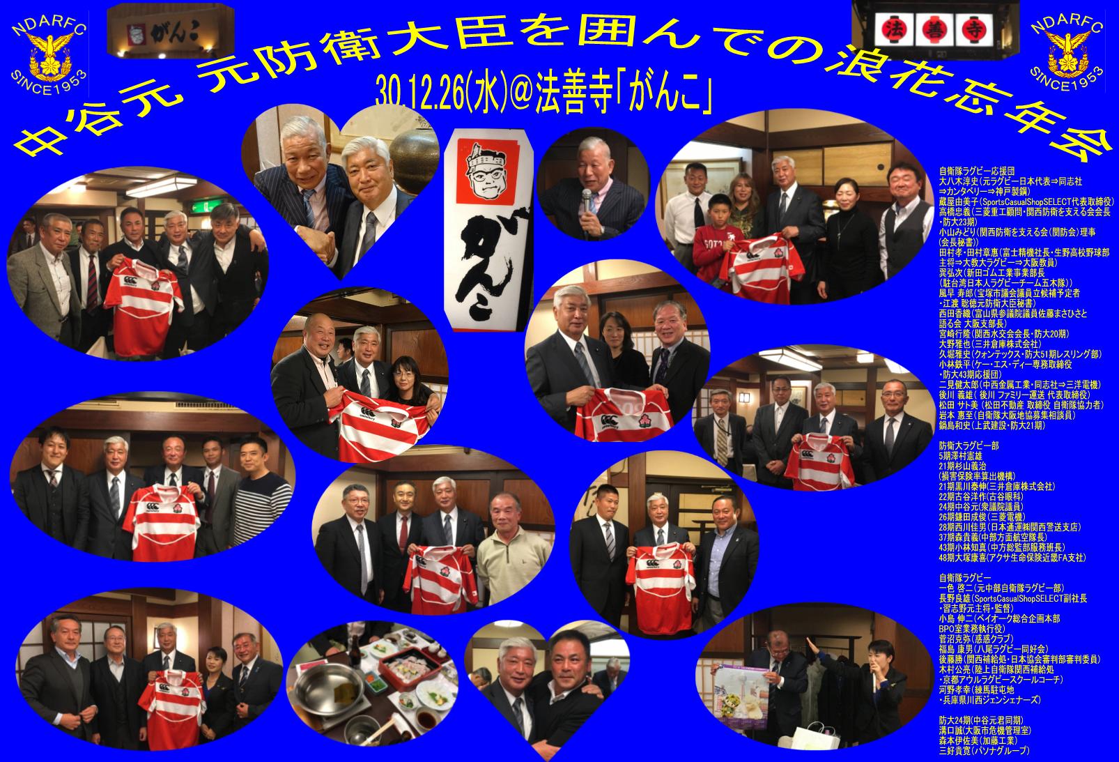 | 30.12.26(水)「がんこ法善寺店」にて《中谷 元防衛大臣を囲んでの浪花忘年会》を行いました。 参加者は、2次会を含め40名で、メンバーは自衛隊ラグビー応援団・防大ラグビー部OB・現役及び父兄・関西在住・在勤の自衛隊ラグビーを強くする会関係者及び防大24期の方々たちです。 元全日本の大八木淳史さんにも参加いただき、楽しい時間を持つことが出来ました。 来年も行いたいと思いますのでたくさんの方の参加期待します。 作業員長:防大21期ラグビー部黒川 |