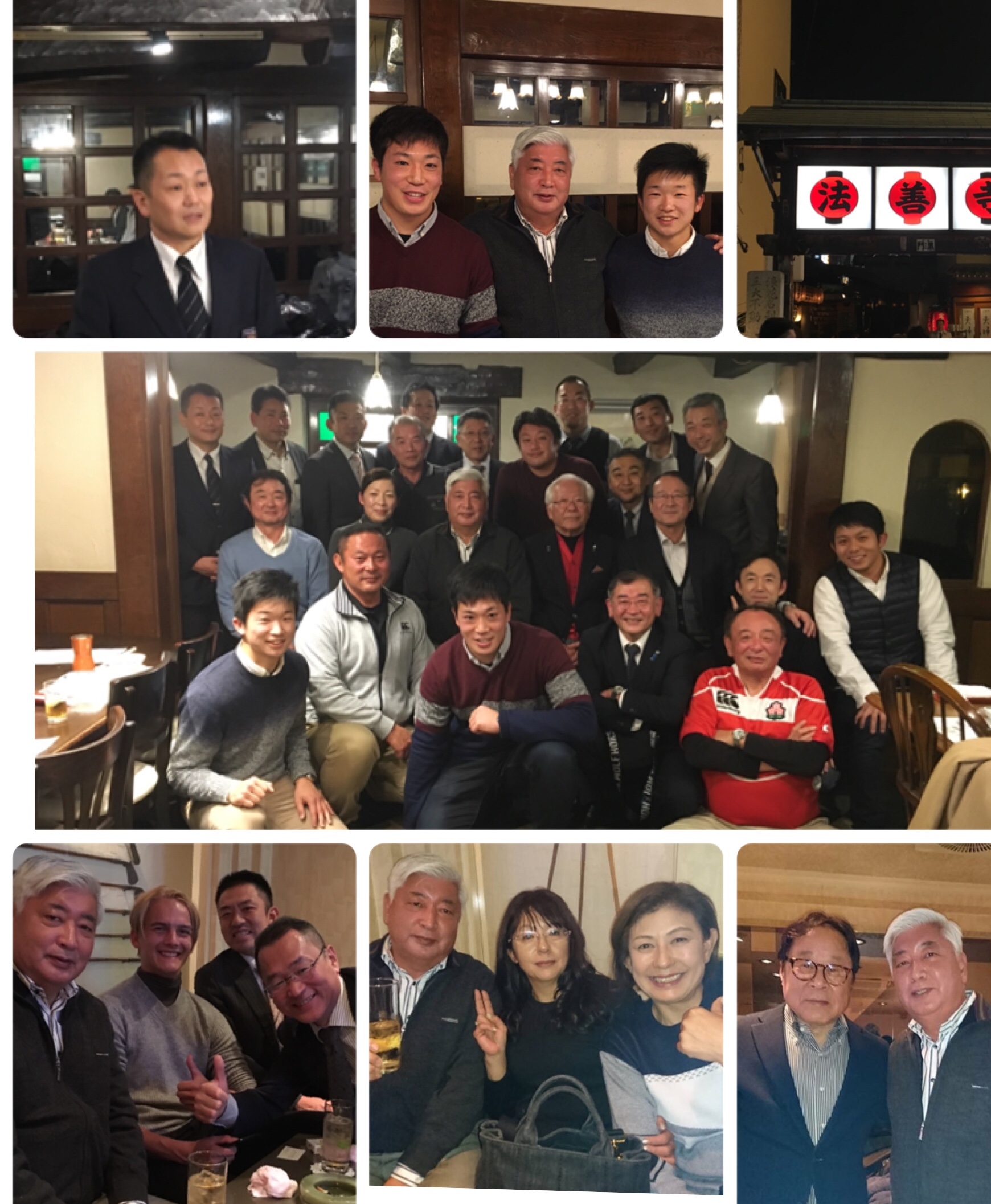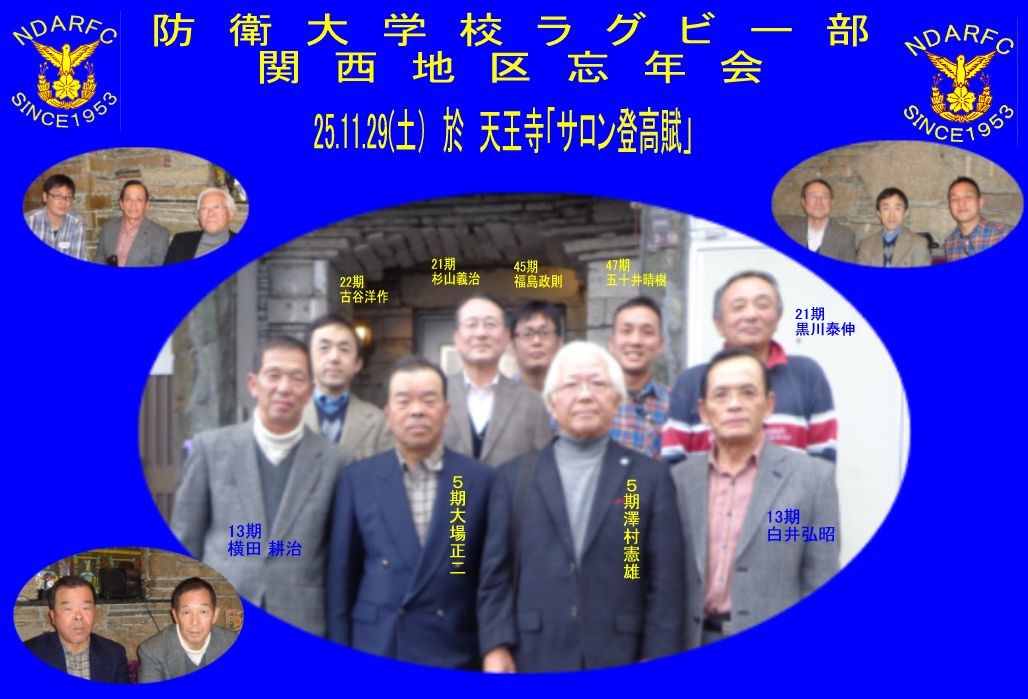 | 防大ラグビー部関西忘年会、5期澤村先輩、7期堀先輩、21期黒川、26期鎌田、60期4年岡田主将、61期3年石角、61期3年堀@登校腑天王寺 その後、茗渓ラグビーOB会長の前田先生にも参加いただきました。感謝、感謝 |