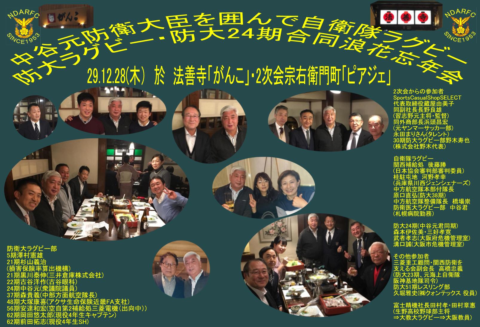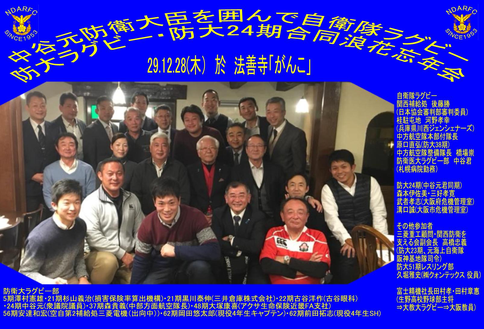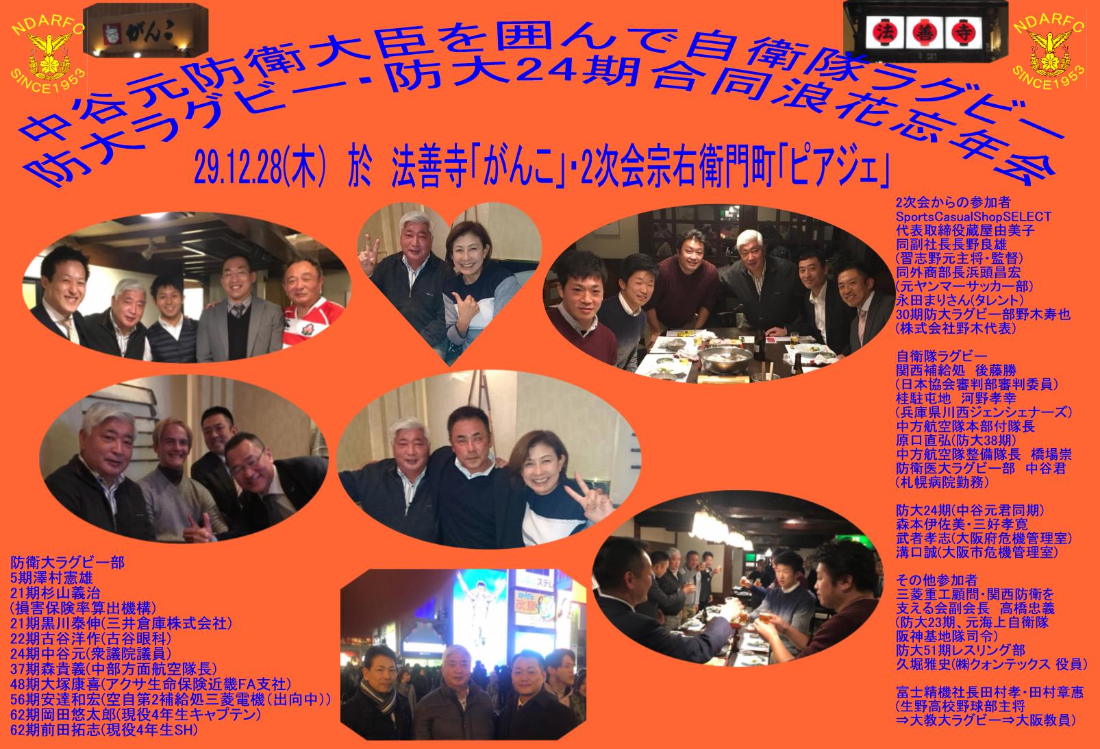 防大ラグビー部・自衛隊ラグビー・ 防大24期合同浪花忘年会 (24期元防衛大臣中谷元君を囲んで) 29.11.28(木) at法善寺「がんこ」 2次会宗右衛門町「ピアジェ」 |